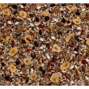 Nasiona (1% chia, 1% quinoa), zboża, owoce (2% suszony banan, 0,8% suszone jagody jarzębiny, 1% rodzynki, 0,7% suszone owoce róży, 0,7% suszone jagody jałowca, 0,7% suszone jabłka), warzywa (2% suszona marchew, 0,7% papryczki chili), minerały (2,5% ptasie grysiki), orzechy (1% orzeszki ziemne, 0,7% orzechy włoskie), produkty pochodzenia roślinnego, drożdże, oleje i tłuszcze